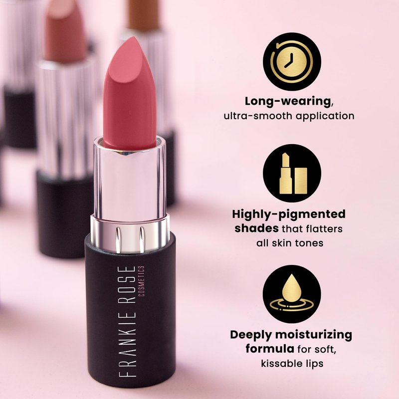 - FULL COVERAGE LIP MAKEUP: Frankie Rose highly pigmented lip colors can be used alone or with lip gloss for that picture-perfect pout. Each of our smudge-proof lipsticks for women are buildable and designed to compliment all skin tones.
