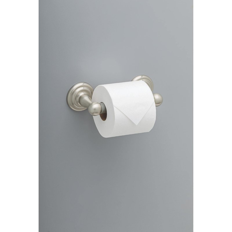- This toilet paper holder takes up minimal space in a universal satin nickel finish