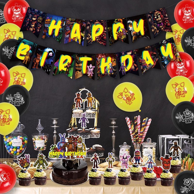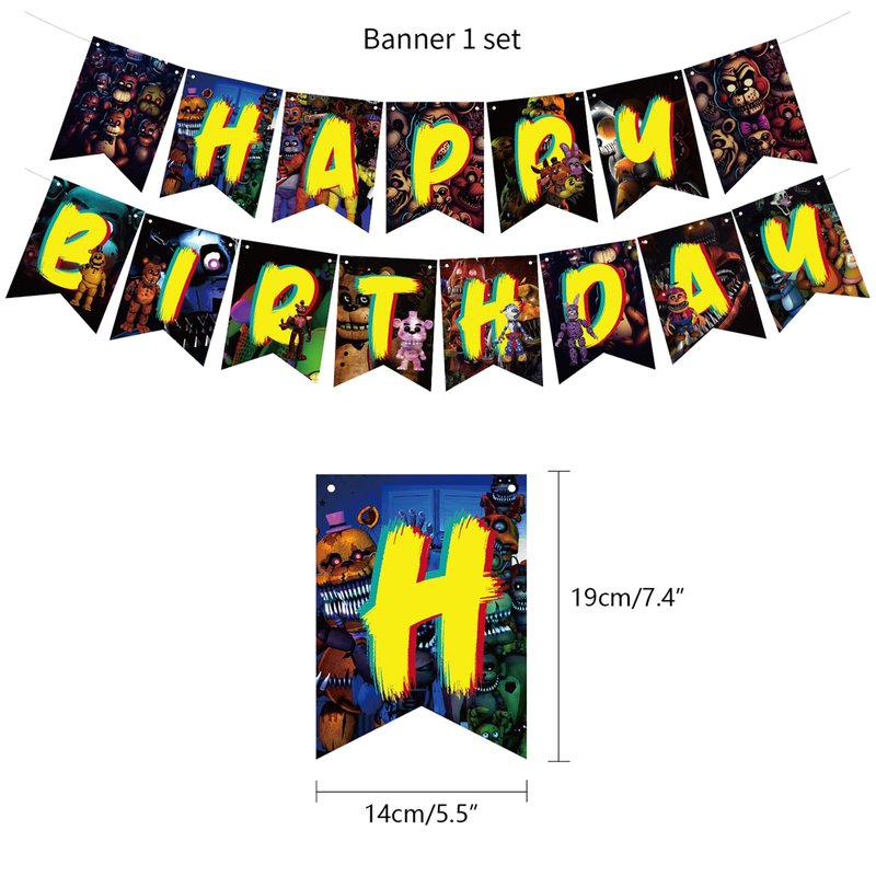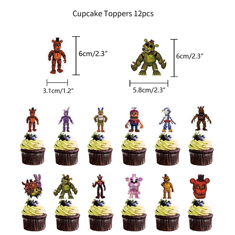 - Freddy's decorations package include: 1pc big cake topper, 1pc banner, 12pcs cupcake toppers,18pcs balloons, which is your best choice for Freddy's party decoration.