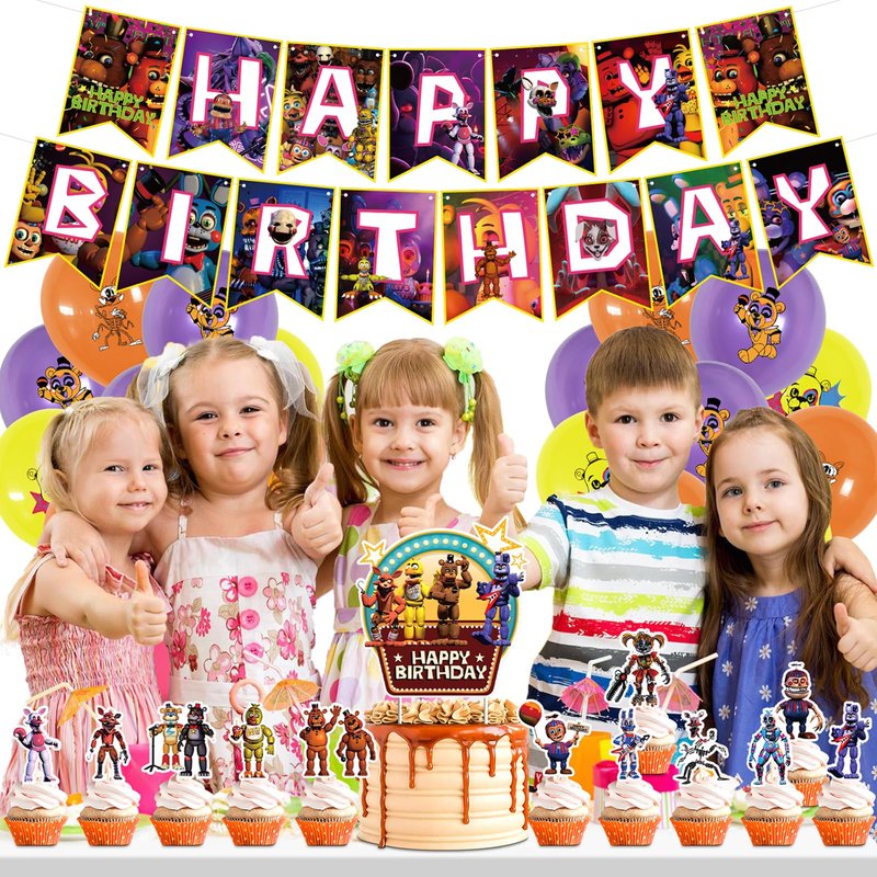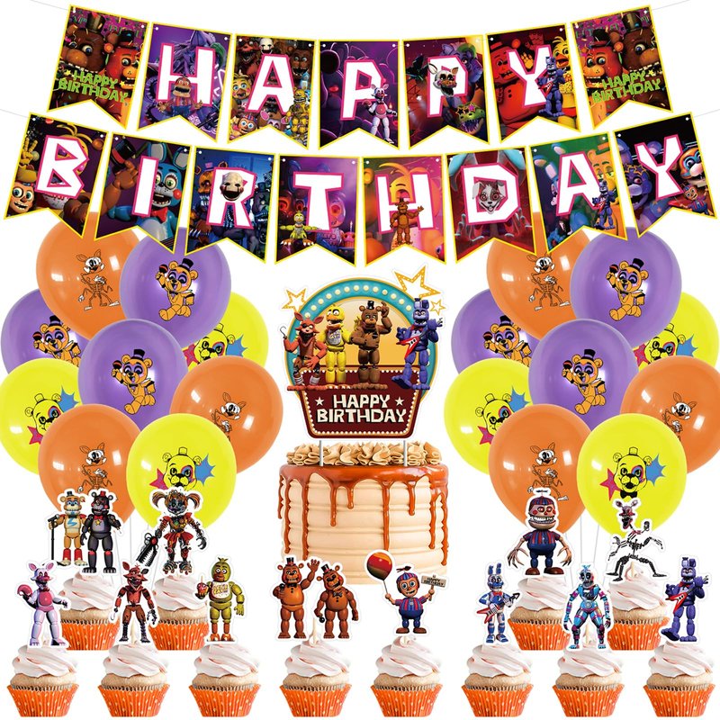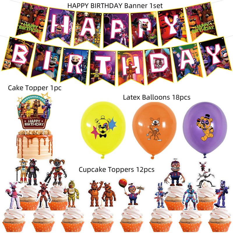 - Freddy's decorations package include: 1pc big cake topper, 1pc banner, 12pcs cupcake toppers,18pcs balloons, which is your best choice for Freddy's party decoration.