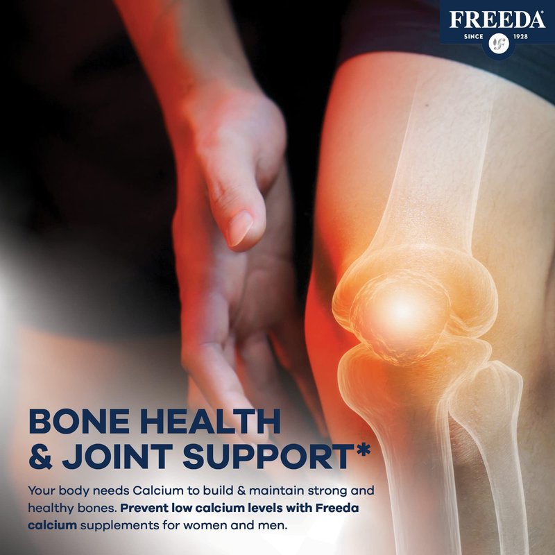 - BONE HEALTH & JOINT SUPPORT - Your body needs Calcium to build & maintain strong and healthy bones. Help prevent low calcium levels with Freeda calcium supplements for women and men. Calcium for women and men bone supplements help ensure your daily calcium intake never falls below recommended levels.*