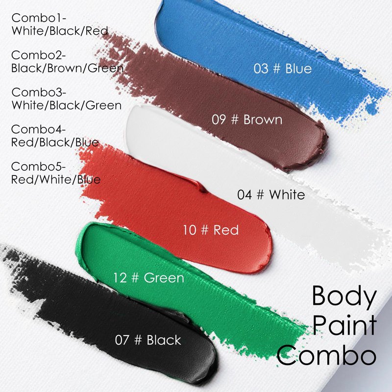 - 【3 Colors Face Paint Makeup Kit】Face paint kit available for 3 colors face& body paint combo to bid.Combo1-White/Black/Red.Combo2- Black/Brown/Green.Combo3- White/Black/Green. Whatever white/red/green face paint makeup even as eye black ,it all meet your needs.
