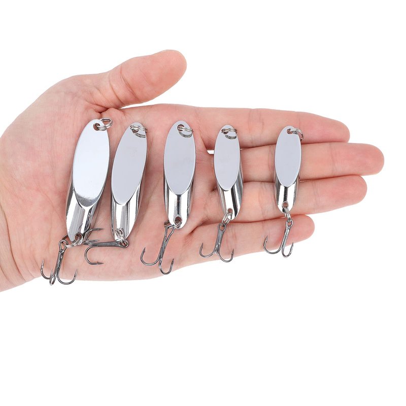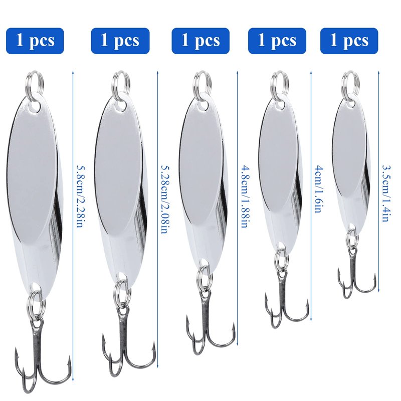 Specifications:Size: 1/5 oz, 1/4 oz, 3/8 oz, 1/2 oz, 3/4 oz Quantity: 5Packs Features:1.High-quality Material: The Spoon is made of zinc alloy, which is more durable and anti-rust, and can catch all kinds of fish; in addition, there are enough numbers for you to use and replace.2Fish Treble Hook: The fish head clamp is equipped with a pointed carbon steel treble Hooks, which is strong and durable, helping to hold the fish firmly in battle.3.Wide range of application: fish spoon bait is widely used in a variety of fish, such as catfish, bass, redfish, goldfish, bigeye, bass, trout, sea bream, musk, etc.; fish spoon bait is also suitable for fresh water and salt water , Very suitable for fishing enthusiasts. Package includes:5pcs fishing Lures