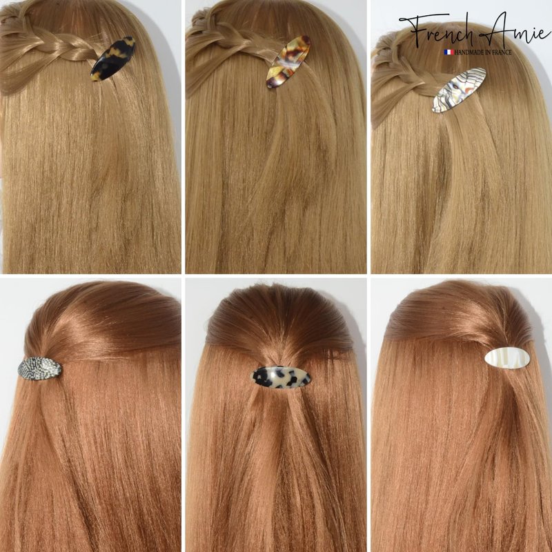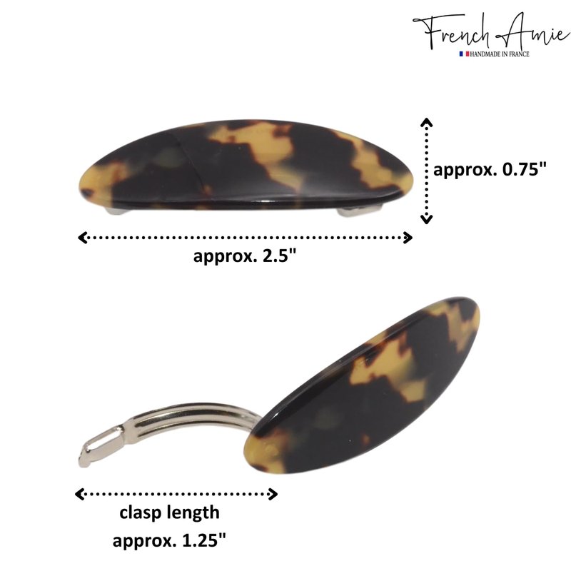 - These unique French oval barrettes for girls and women are accentuated with a solid metal clasp, a key piece to be kept in your hair accessories. The size of the barrette is approx. 2.5 inch x 0.75 inch (5 cm x 2 cm).