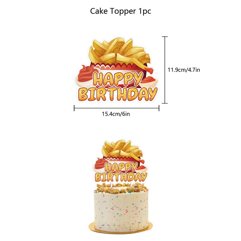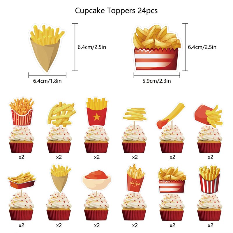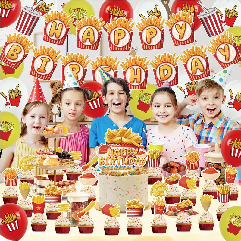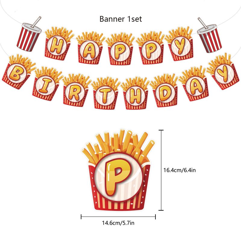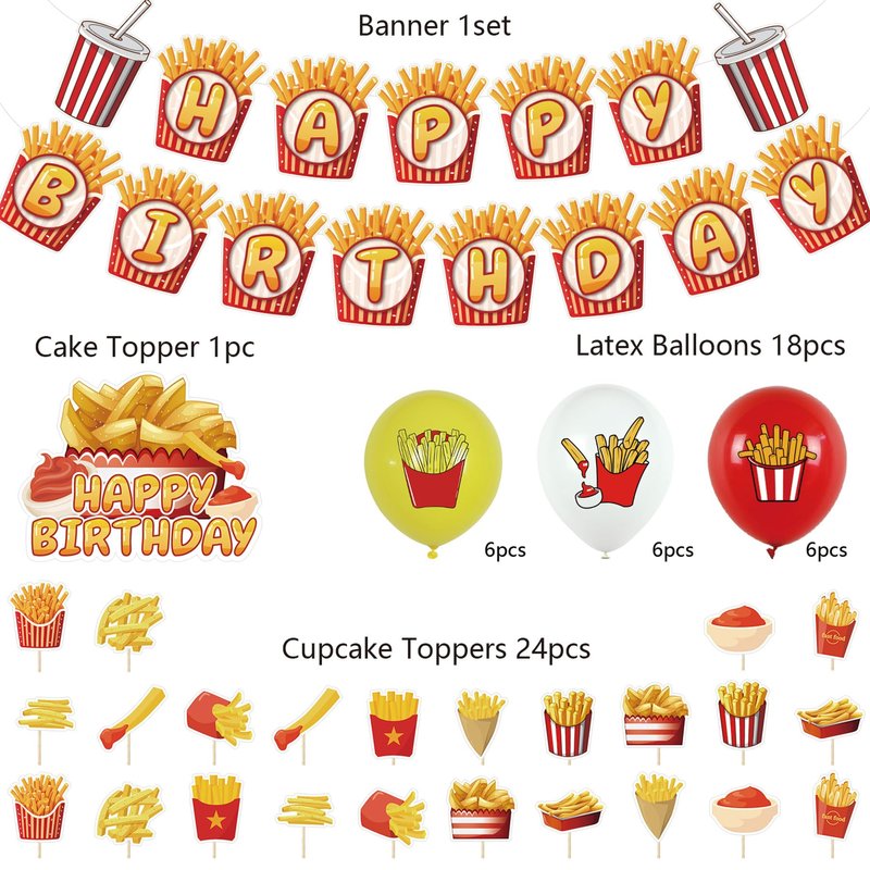 - French Fries Birthday Party Supplies Set Package includes: You will get 1 * HAPPY BIRTHDAY banner, 18 * balloon (3 styles of 6 each), 1 * cake topper, 24 * cupcake topper, each accessory has french fries elements, these party decorations will bring more fun to your party