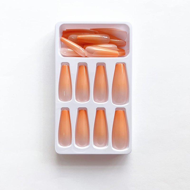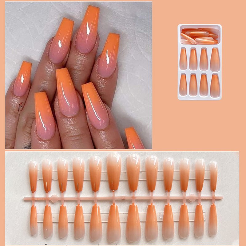 French Press on Nails Long Coffin Fake Nails Full Cover False Nails with gradient Design Acrylic Nails for Women and Girls 24Pcs (orange)