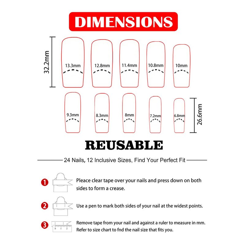 - Fingernails Package: 24pcs press on nails,24 pcs jelly glue ,1 An alcohol bag,1 nail file and 1 small wooden stick,Meet the needs of tools required by your DIY.