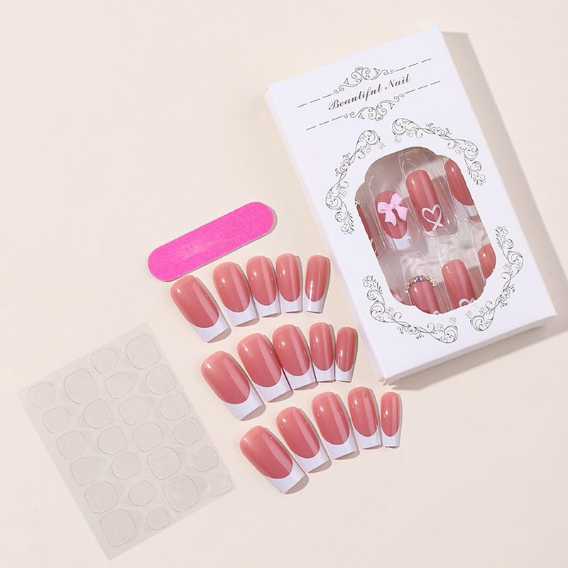 French Tip Press on Nails with Charms Medium Fake Nails White French Nails Press ons Cute Bow Stick on Nails Long Square Shape Acrylic Nails Heart Nails Rhinestones Nails for Women Daily Wear