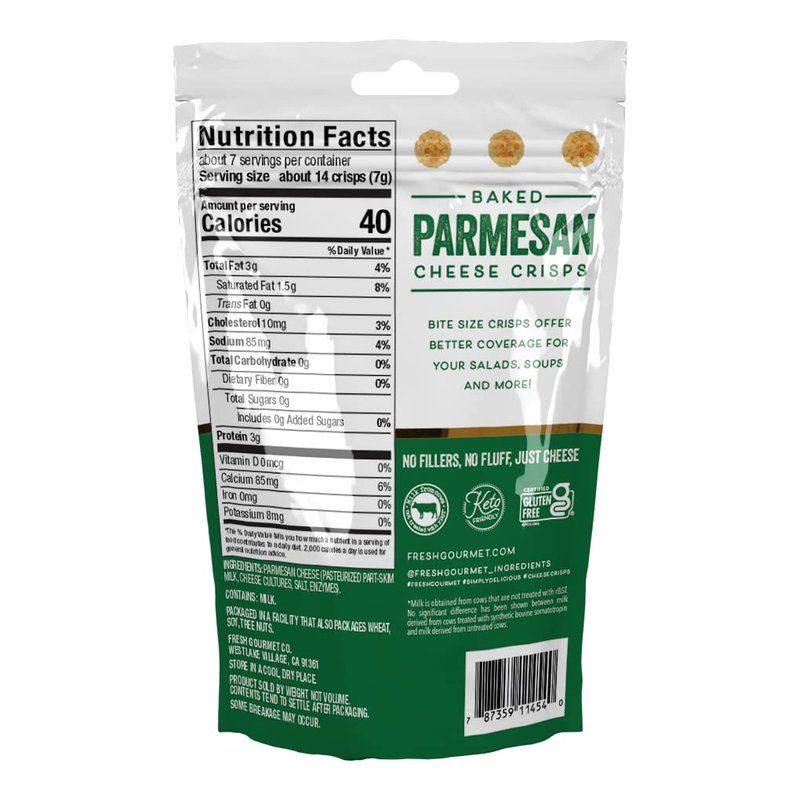 - PARMESAN CHEESE CRISPS: Fresh Gourmet Cheese Crisps made from baked 100% Parmesan Cheese; 1.76-oz. (Pack of 1)