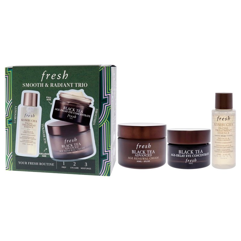 Fresh Smooth And Radiant Trio for Women - 3 Pc 0.67oz Kombucha Antioxidant Facial Treatment Essence, 0.50oz Black Tea Age Delay Eye Cream, 1oz Black Tea Anti Aging Ceramide Moisturizer