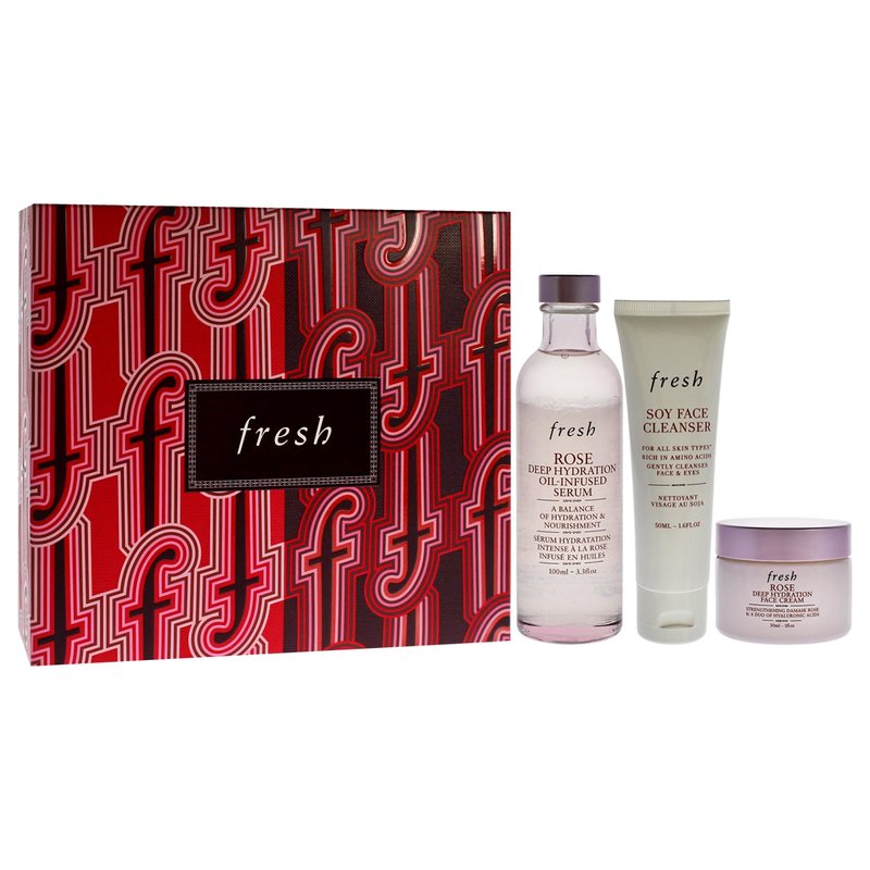 Fresh Three Step Hydration Heroes Kit for Women - 3 Pc 1.6oz Soy Face Cleanser, 3.4oz Rose Deep Hydration Oil Infused Serum, 1oz Rose Deep Hydration Face Cream