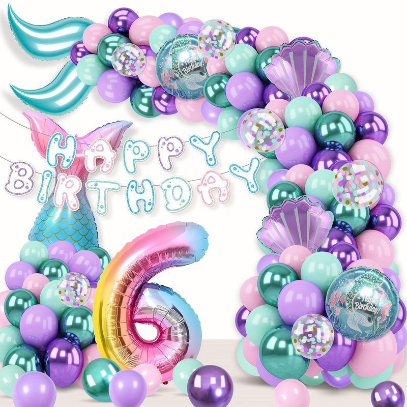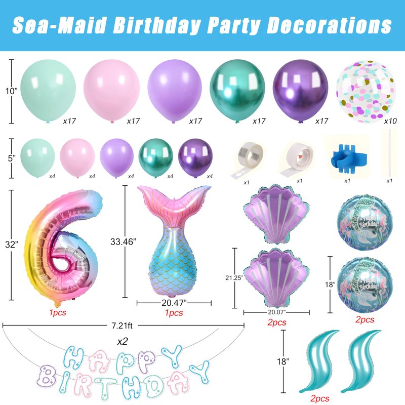 - What’s in the package: Come with 125pcs totally,including 1pcs number 6 foil balloon.2pcs HAPPY BIRTHDAY banners.1pcs sea-maid tail foil balloon.2pcs shell foil balloons.2pcs s-shaped foil balloons.85pcs 10” balloons(metallic green/light green,metallic purple/light purple/light pink,17pcs of each color).20pcs 5” balloons(metallic green/light green,metallic purple/light purple/light pink,4pcs of each).6pcs 10” confetti balloons.4pcs balloons tools
