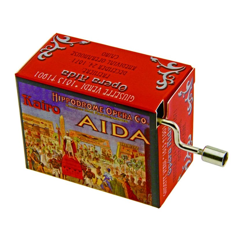 Metal hand crank music box fixed on a piece of wood in imprinted cardboard box. The cardboard box measures 2 1/4 x 1 3/4 x 1 1/4 inches plus handle. Melody: Triumphal March Opera Aida. Best sound will be reached when holding the music box at the wooden layer or put it on a wooden table. Handle is to be moved clockwise in a steady, continuous way for best melody result. Imported from Germany from Fridolin.