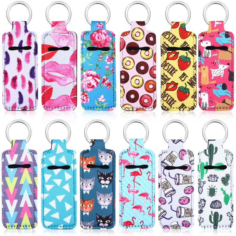 12 Pieces mini lipstick holder keychain lip balm holders elastic waterproof neoprene lipstick tracker sleeve keychains egg toy filler travel accessories with metal ring for birthday gift, 12 styles