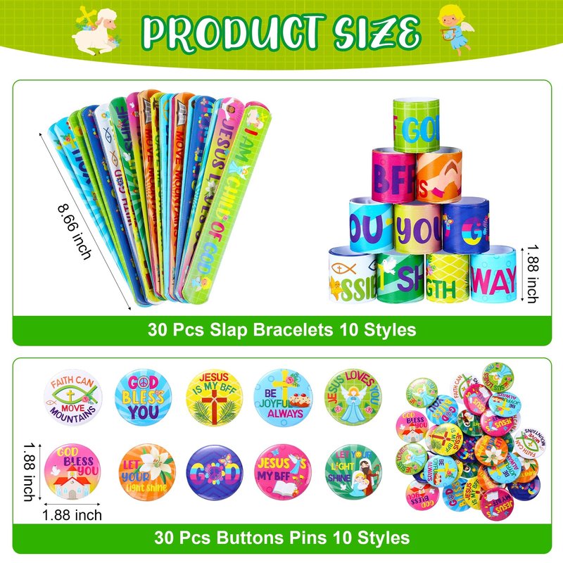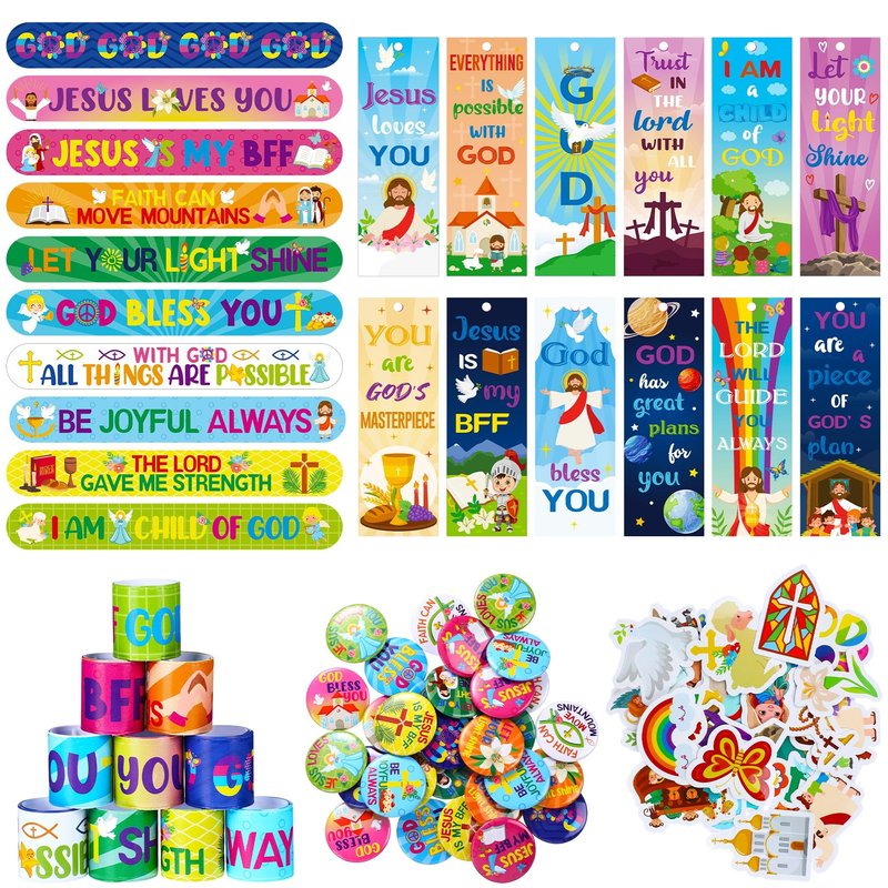• Religious Party Favors: you will get 170 pieces of christian gifts for kids, including 30 pieces of christian slap bracelets, 30 pieces of religious mini buttons, 50 pieces of Jesus stickers bulk and 60 pieces of bible verses paper bookmarks, which have 10, 10, 50 and 12 styles respectively, rich quantities and multiple styles can meet your needs for Sunday school religious party favors, birthday party gifts or classroom prizes