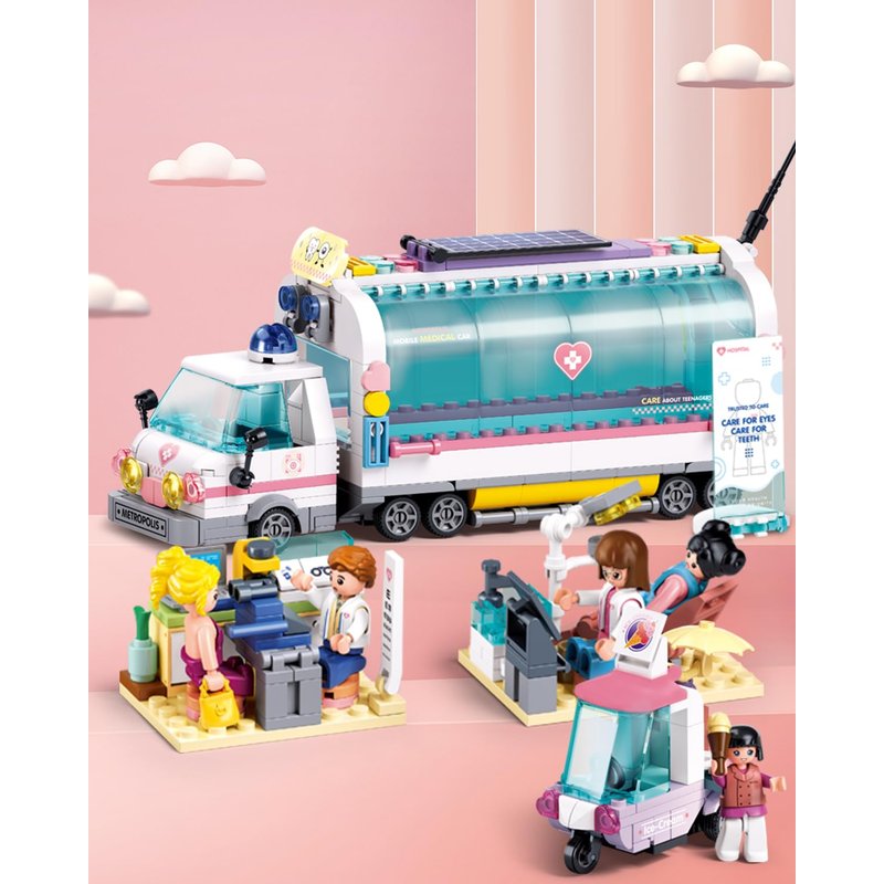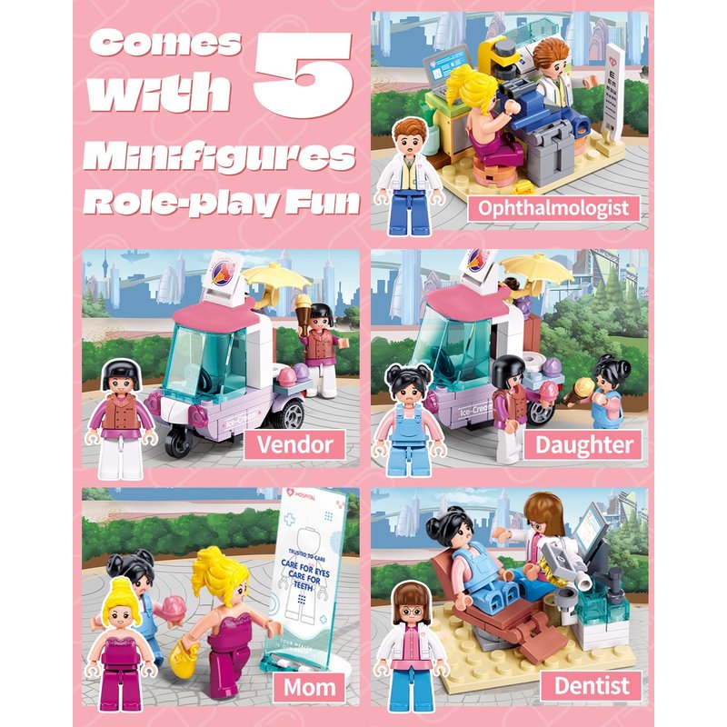 - 【5 Minifigures for Endless Role-Play】Join the fun with 5 delightful minifigures: Ice-cream Vendor, Daughter, Ophthalmologist, Mom, and Dentist. Kids can immerse themselves in imaginative role-play, adopting various roles and fostering social skills in a world of pretend healthcare and sweet treats. Ideal for girls who love ambulance toy and hospital sets!