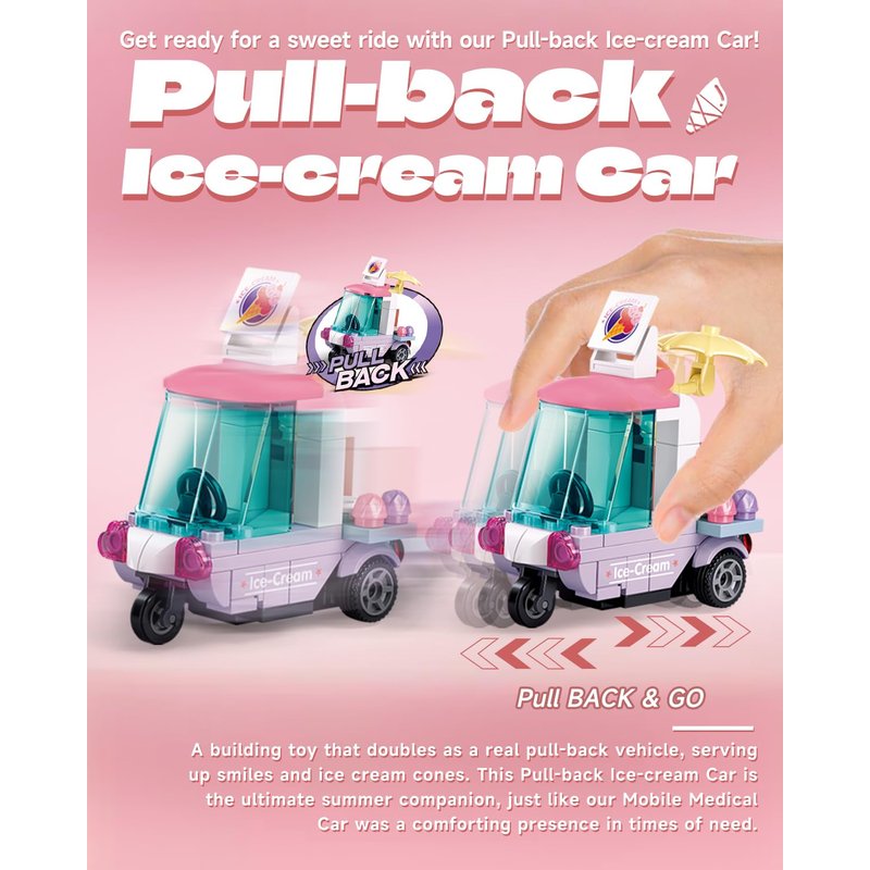 - 【Medical & Ice-cream Adventures】Embark on a fun and healthy journey with our Mobile Medical Car toys and Ice-cream Car! The Medical Car toy, adorned with solar panels and a see-through design, features detachable dental and eye clinics for on-the-go care. The Ice-cream Push-back Car glides smoothly, covering a distance of 13 feet, adding a touch of sweetness to your child's playtime.