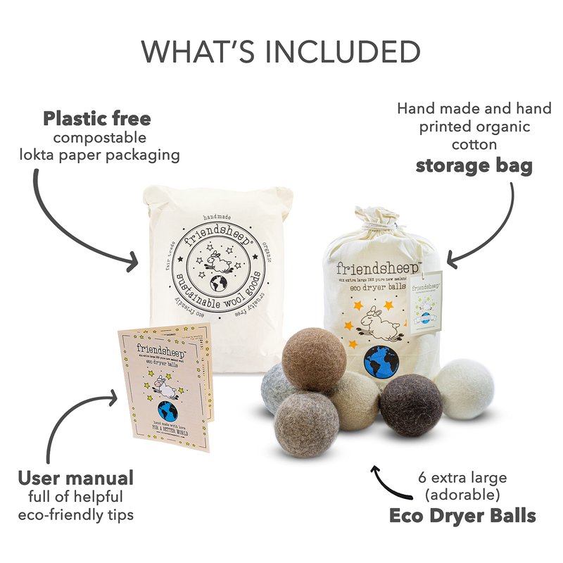 - SET OF 6 EXTRA LARGE WOOL BALLS, comes in a FREE beautiful hand printed organic gift bag. Biodegradable and compostable product comes in a compostable package, is the THE PERFECT ECO-FRIENDLY ANY OCCASION GIFT: Christmas, Birthdays, Best Friends Day, Baby Showers, Bridal Showers, Weddings, Teacher Appreciation, Mothers Day, Housewarming, College Graduation, Easter, and more!
