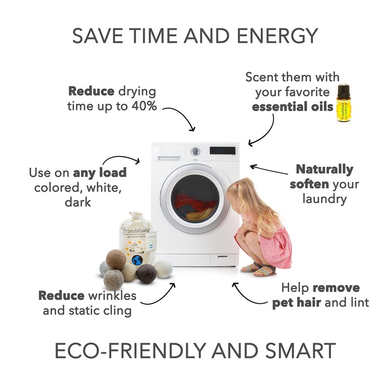Friendsheep Eco Dryer Balls will soak up moisture in your dryer by absorbing up to 30% of their weight in water. Plus, their movement in the dryer will help separate your clothes and sheets allowing air and heat to circulate and dry them faster. As your laundry dries, the dryer balls will fluff and evenly redistribute humidity in the dryer eliminating wrinkles, reducing static cling and providing a softer feel to your fabrics. The result is a quicker drying time, softer and more manageable laundry, all with less energy used, and more money in your pocket!