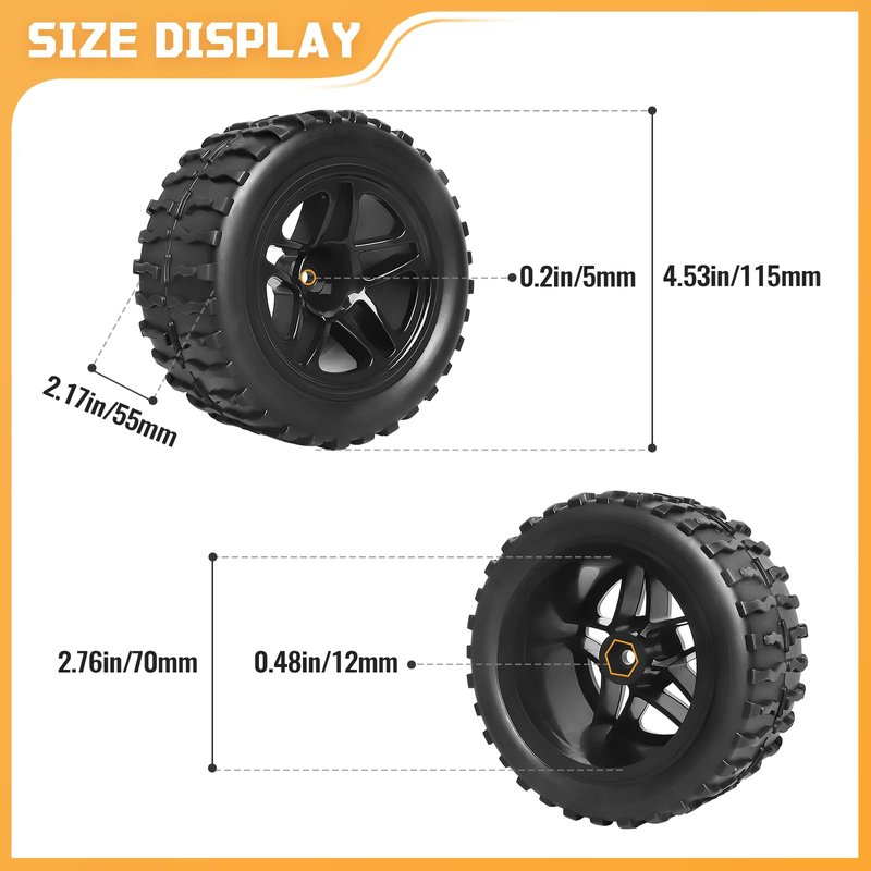 - 【Size】Tires Height(Outer Diameter): 4.53" (115mm), Width:2.17" (55mm); Wheel Inner Diameter: 2.76" (70mm), Wheel Hubs:12mm Hex; Axle Hole: 5mm--->Notice: Please check the height of the tires to ensure they fit your RC vehicle properly
