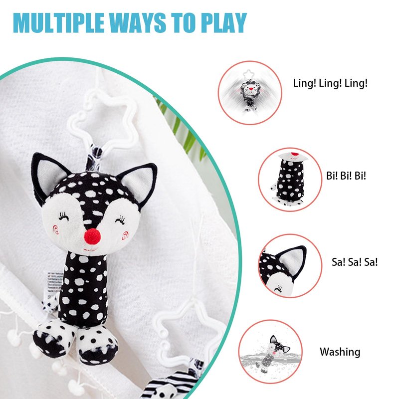 - 【Promote Visual and Auditory Development】: Frilida black and white series of plush baby toys has four animal patterns of fox, lion, elephant and cow. The cute shape can effectively attract baby's attention and help them exercise hand-eye coordination, hearing and visual perception while playing by touching, pulling and shak.
