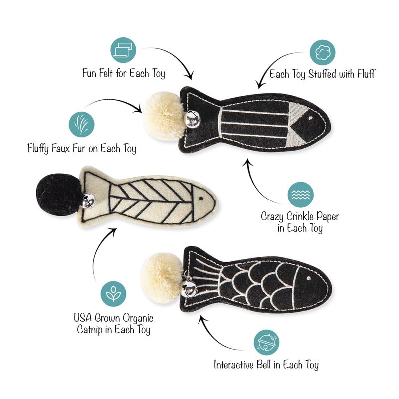 - Perfect for all-sized cats, Black stripe fish: 1.5" h x 5" w, White chevron fish: 1.5" h x 5" w, Black scale fish: 1.5" h x 5" w
