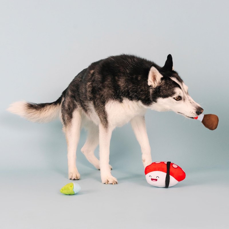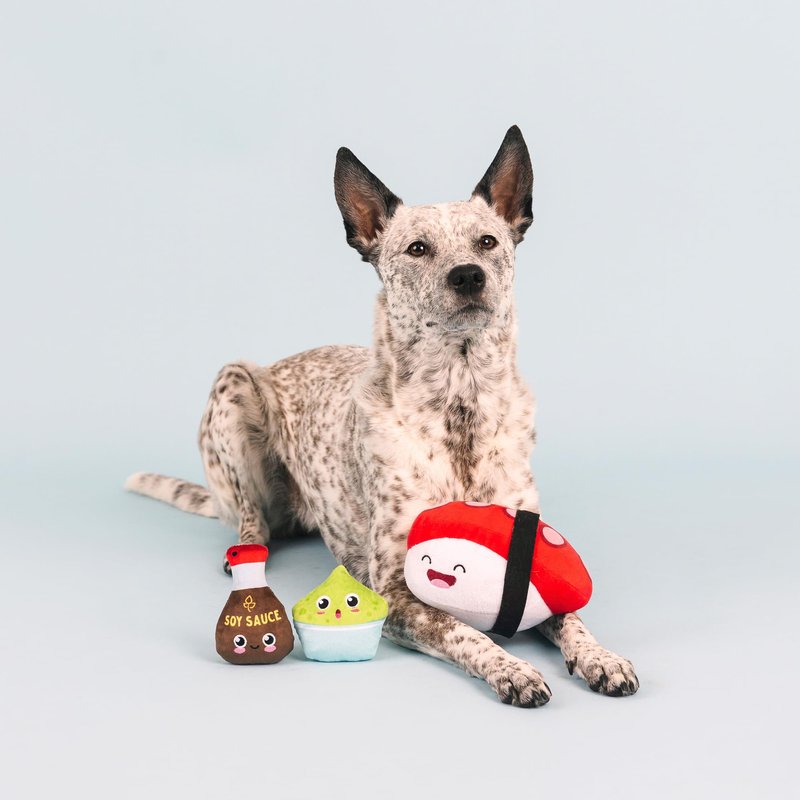- Large toy is approximately 4.5” x 7”, Each mini toy is approximately 3.75” x 3” (SUSHI: 4.5" X 7" X 4", SOY SAUCE: 4" X 2.75", WASABI: 3.5 " X 3.5")