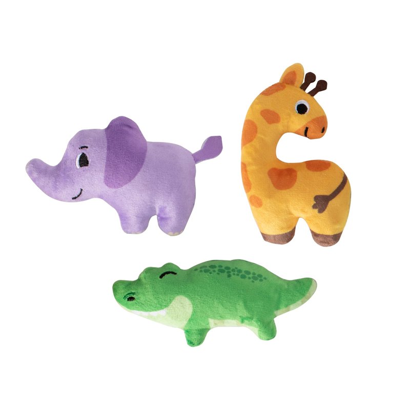 - Each toy is approximately 3.75” x 3.5” ( MONKEY: 4.5" X 3", GIRAFFE: 4.5" X 2.5", ELEPHANT: 2.75" X 5" )