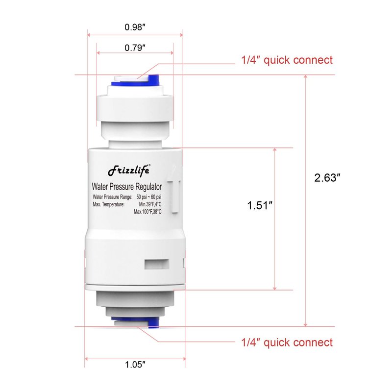 Frizzlife PRV01 Pressure Regulator / Protection Valve is to be installed before water applicants such as reverse osmosis system, water filter, ice maker, coffee machine, chiller, hot tank, water cooler and etc. that are sensitive to water pressure.