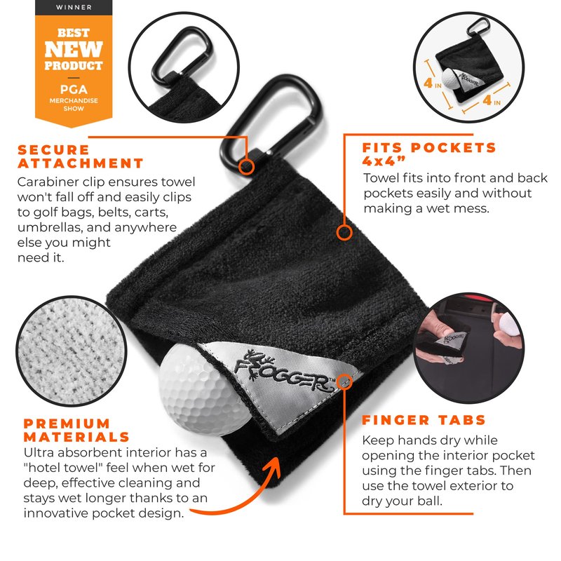 - PERFECT SIZE TOWEL: Frogger’s pocket size Golf Towel with its 2-IN-1 wet and dry waterproof technology is the perfect size golf towel to carry with you everywhere you go. Wipe off mud, dirt, grass stains and water off your golf ball in one go.