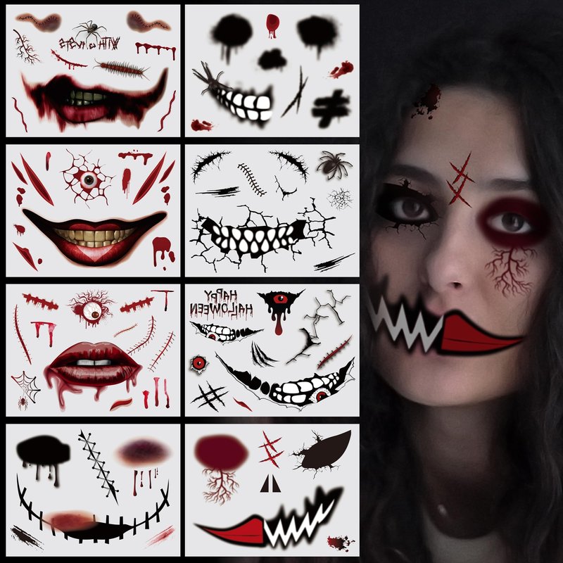 - Multiple Style: 8 sheets all in one package, including Halloween fake blood, fake scars tattoos, stitched up cuts, slashes and gashes, bloody mouth etc.. Suitable for all your role plays in Halloween! Give you more exciting and fun experience, let you more immersed, enjoy the party atmosphere and fun!