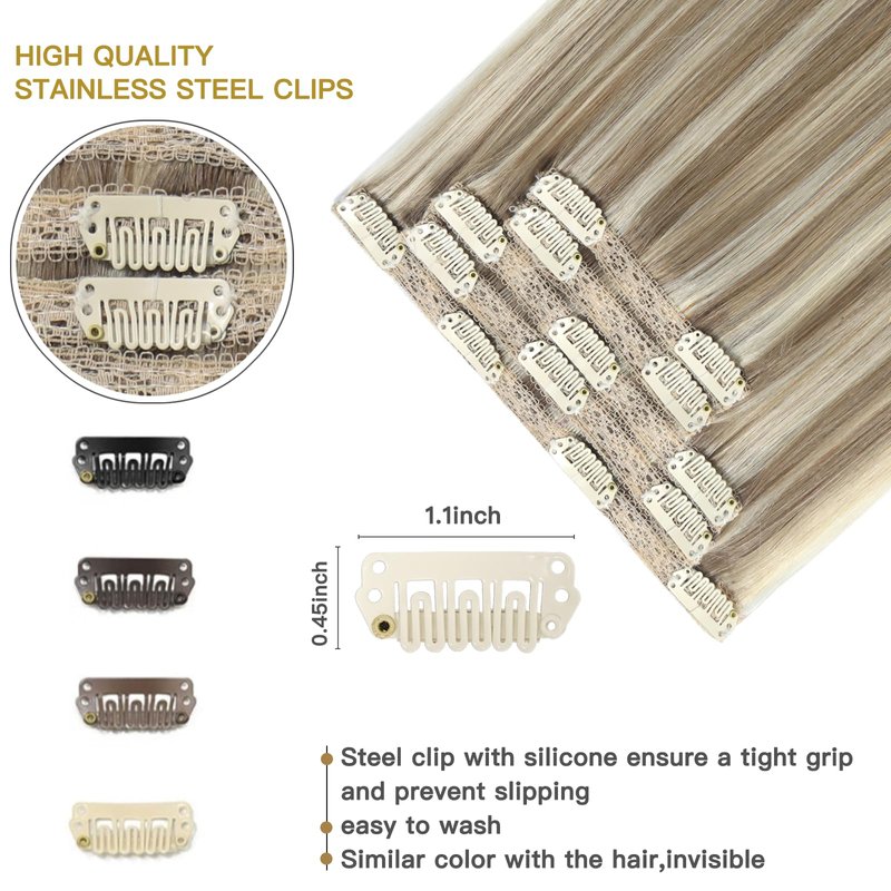 - 【Easy Wearing】stainless steel clips with Silicone, flexible and fast, easy to remove and wear. The back has a soft silicone to ensure a tight grip and prevent slipping and does not harm your hair and scalp. The color of the clip is close to the hair and is very invisible. Whether it is party or sports, or other occasions, you can change the shape arbitrarily. Our clip in hair extensions human hair can last for 3-4 months, it is long-lasting with good care.