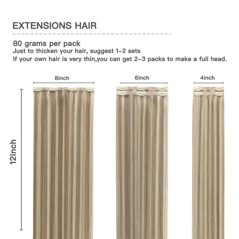 - 【Specifications of Human Hair Extensions】clip in human hair extensions, 5 pieces 80g with 14 clips per set. 70g net weight without clips, 80g with clips. If you want to add length and volume, we recommend 1-2 sets, for a full head, suggest 2-3 sets. If you want to add Highlights Color Effect, we recommend purchasing with our 30G clip-in hair extensions together. When the weight is the same , the longer size will be thinner than the shorter size.