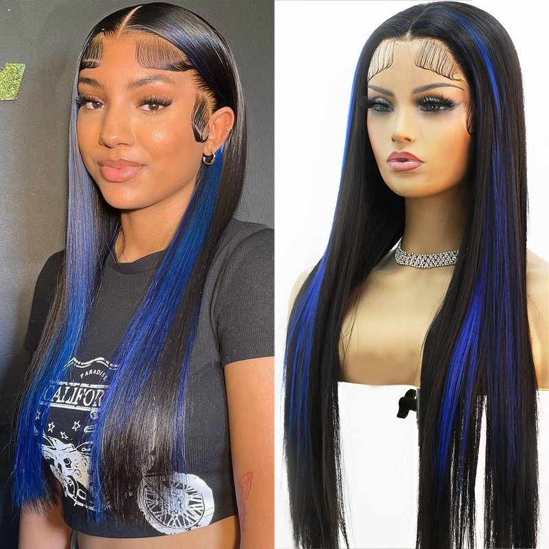 Fugady Blue Highlight Wig Long Straight Lace Front Wig Black and Blue Synthetic Lace Front Wigs for Black Women Pre Plucked with Baby Hair Heat Resistant for Daily Use 24 Inches(Synthetic| 13 * 4 Lace Frontal)