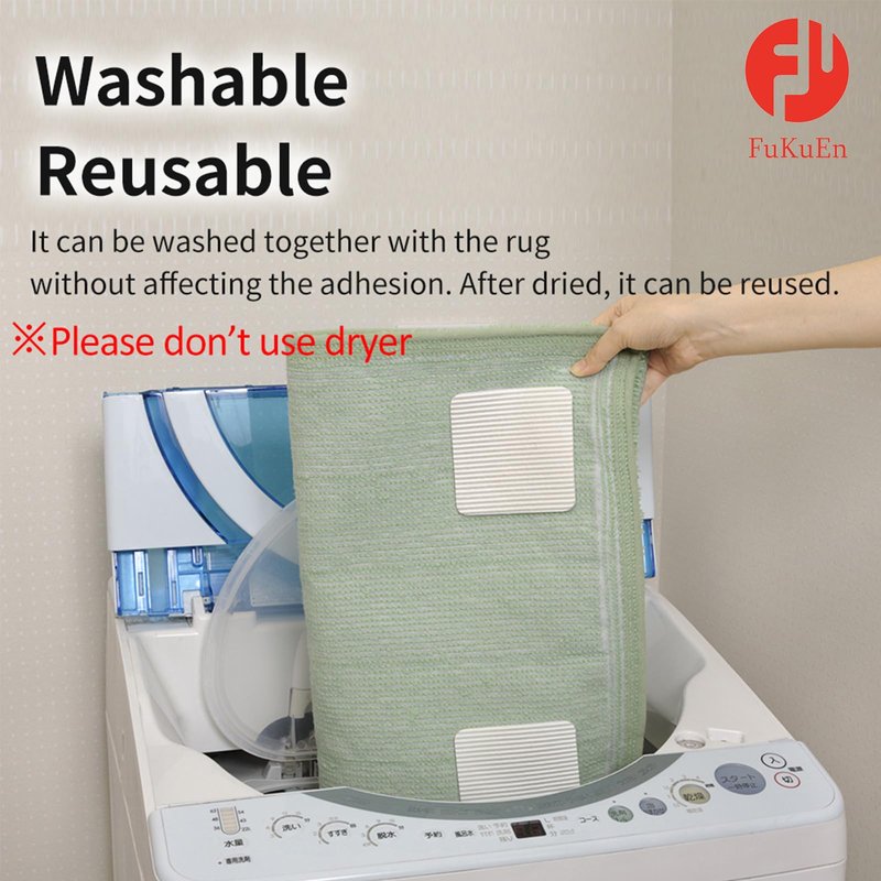 - Washable and reusable. These grippers are easy to clean and can be machine washed together with the rug without affecting the adhesion. After dried, it can be reused