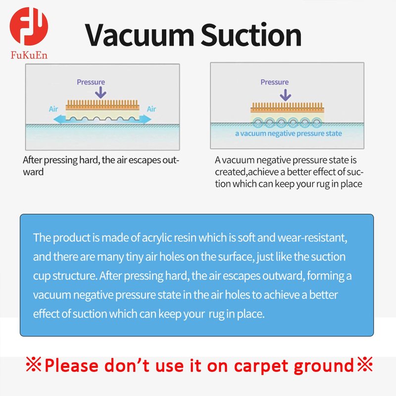 - New material, vacuum technology. This grippers can easily stick under any carpet. These grippers use Vacuum Suction which can ensure a firm grip on floor and keep your rug in place, stop curling and slipping. The carpet tape adds extra comfort underfoot due to the slight elasticity of the vacuum technology.