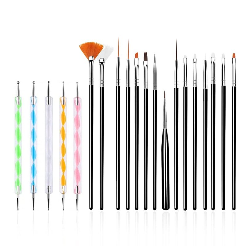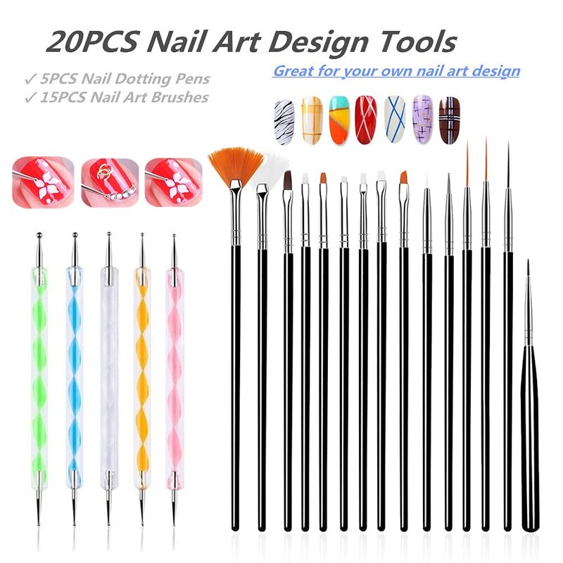 20PCS Nail Art Design Tools : 5PCS Nail Dotting Pens & 15PCS Nails Art Brushes Features: Includes 5 Pieces 2-Way Dotting Pen Tool Nail Art Tip Dot Paint Manicure kit 5 Pieces nail art dotting pens, each is end with a large ball and another end with a small ball for various size dotting. Pen heads are in different sizes can produce beautiful patterns, flowers, dots, outlined and so on. Includes 15 Pieces of nail art brushes in different lengths, meeting your basic needs for creating nail arts. The bristles are nice so they hold polish well and you don't have to keep dipping your brush. Perfect for doing acrylic nails, suitable for nail gel applying and so on. Great brushes for beginners, making application so much easier. Suitable for professional use or home use. Specifications: - 5PCS Nail Dotting Pens Material: Acrylic & Stainless Steel Color: Multicolor Pen Length: Approx 13 cm / 5.1inches Ball End Diameter: 3mm, 2.5mm, 2mm, 1.5mm, 1mm, 0.8mm - 15PCS Nails Art Brushes Colour:Black Functionalities: Flat Fan Brushes: Used to draw multiple lines simultaneously. Pattern Brush: Used to draw fine patterns and acrylic nail art. Striping Liner Brushes: For drawing fine lines. Flat Brushes: Perfect for UV Gel nail art and for painting on a thick line of color on your nail. Oblique Angled Brush: For 3D Flower Effects. Dotting Tool: For creating dots, decreasing size and to pull dots into different shapes. Drawing Brush: For line drawing such as Zebra Stripes. Petal Brush: For drawing leaves and petals. Package Includes: 5 x Nail Dotting Pens 15 x Nail Art Brushes