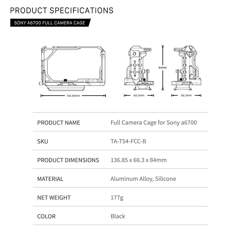 Full Camera Cage Compatible with Sony a6700 - Black | Mount Accessories| Custom Designed | ARCA Ready | Compatible | HDMI CLAMP | TA-T54-FCC-B