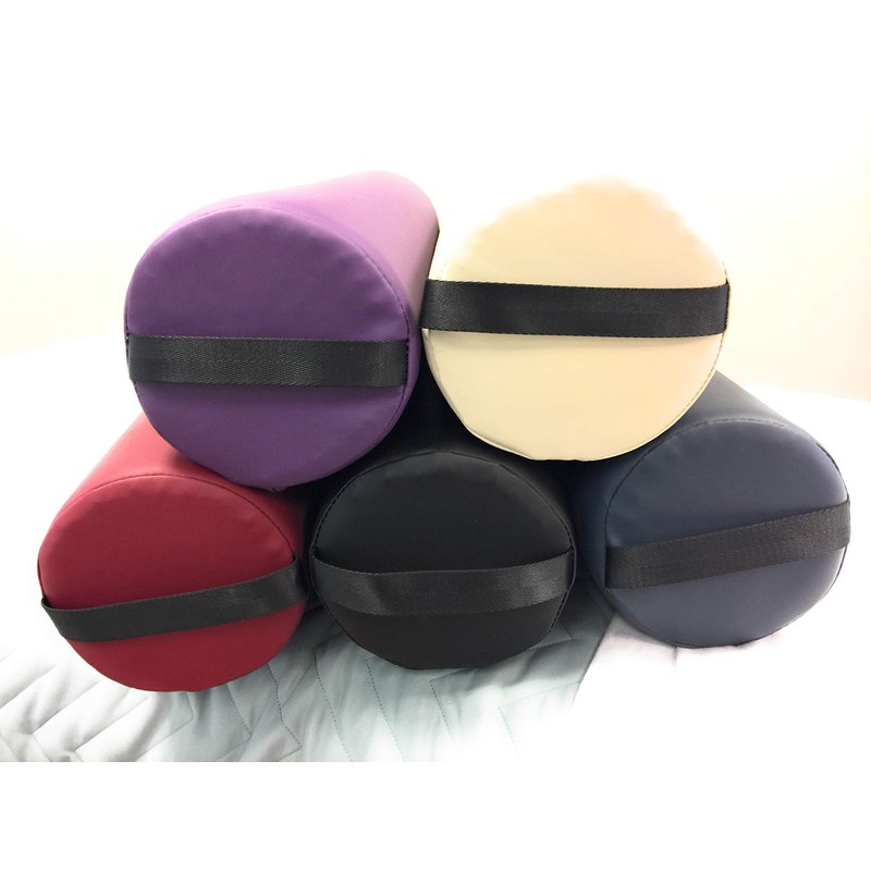 The NRG full round bolster is one of the most popular on the market. Vinyl upholstery has superior abrasion resistance, oil and stain resistant. Its size makes it versatile and a mainstay for many massage therapists and convenient with a black carrying strap at one end.