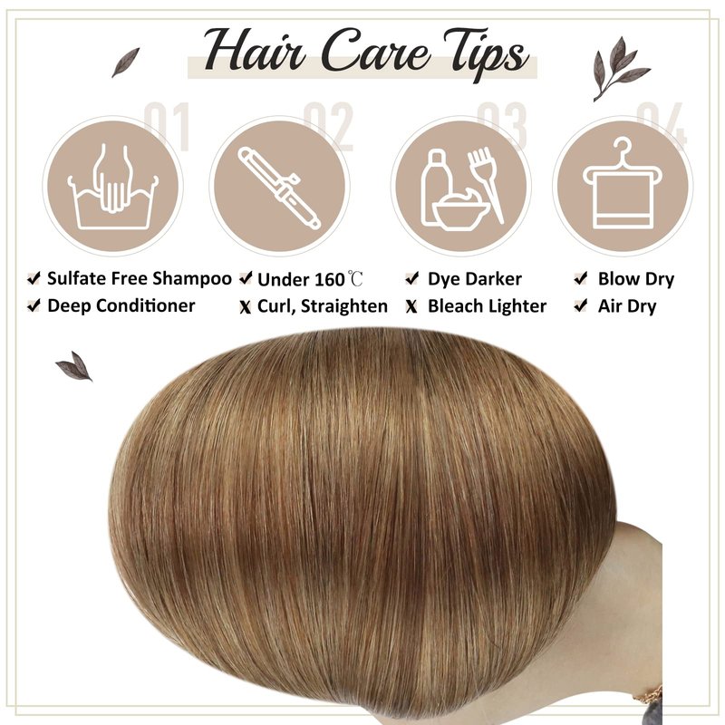 • 【Don't Bleach&Dye】Please do not try to dye or bleach your FullShine human hair extensions,unless you are a very professional hairdresser.Because our hair extensions has undergone dyeing and other treatments,further bleaching or dyeing can damage the hair quality and shorten its lifespan.