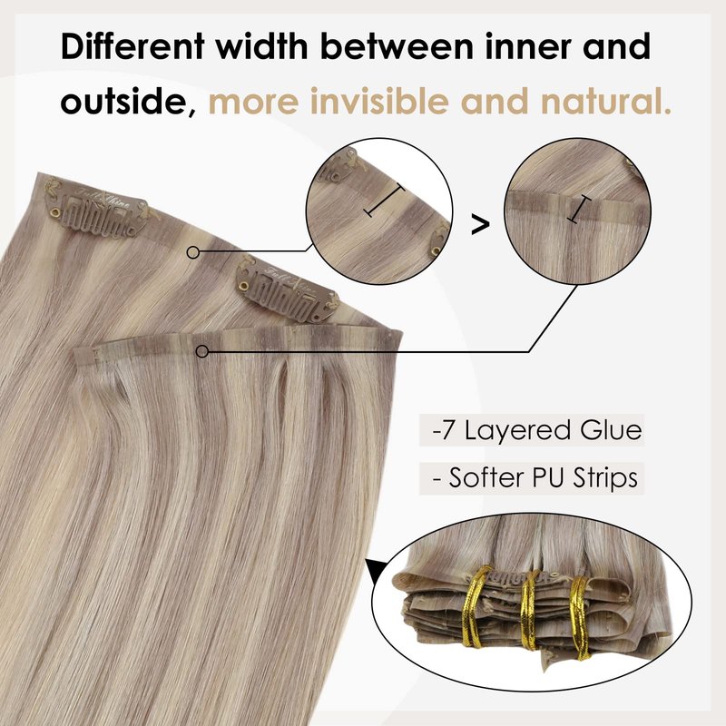 - 【Skin Weft--Invisible & Comfortable & Lighter】Our PU clip hair extensions use latest skin-weft technology to evenly distribute more hair on the PU strip compared to traditional clip-ins.Our new PU clip hair extensions secure the hair on the PU strip, making them more discreet, comfortable, natural, and lightweight. The PU design is seamlessly blended with your scalp and closely matches your skin tone. The outer PU part on each piece is shorter than the inner PU part, so it can be more invisible.