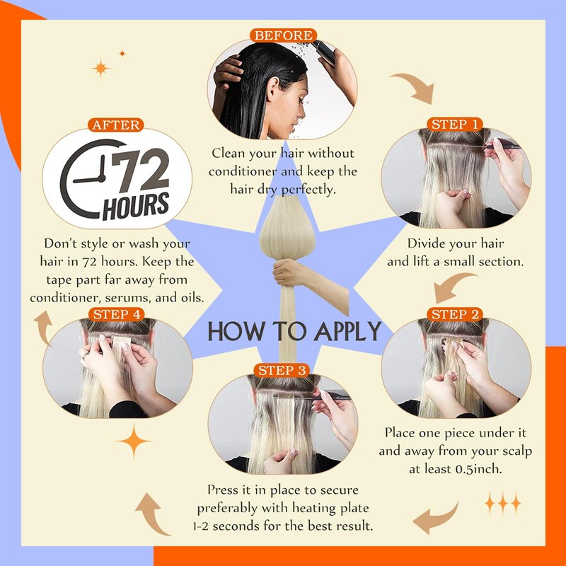 3.Do Not Wash Your Hair At Least 72 Hours After The First Application, And Keep The Sulfate Free Conditioner and Serums Away From The Tape.