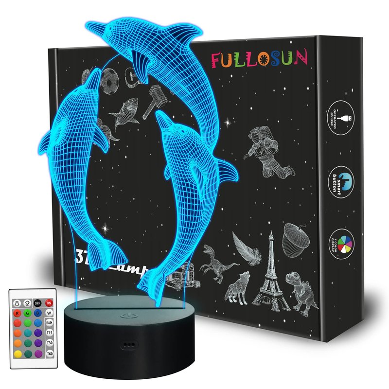 FULLOSUN Night Light for Kids Ocean Dolphin 3D Night Light Porpoise Bedside Lamp with Remote Control 16 Color Changing Xmas Halloween Birthday Gift for Child Baby Girl