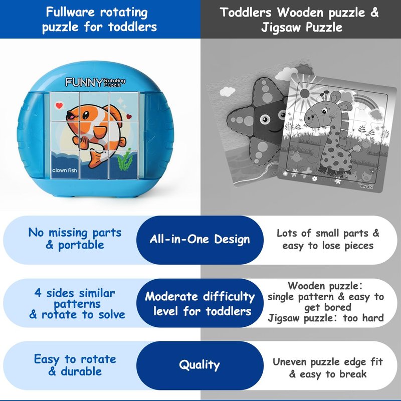 - A HANDY TOY FOR OUTINGS - Whether in the car or at a restaurant, our compact Rotating Puzzles can be carried along and it keeps children quiet and occupied. Moreover, there is no risk of missing pieces after playing with this all-in-one design puzzle!