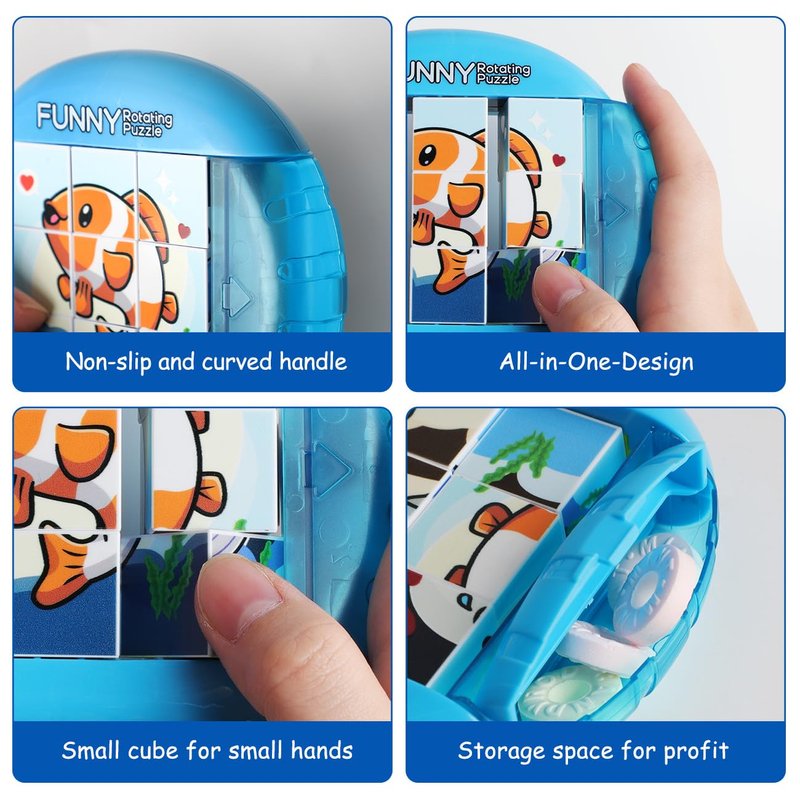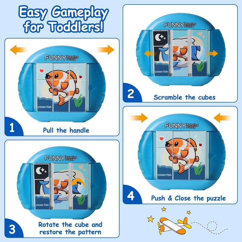 Introducing our compact Rotating Puzzles - a portable toy perfect for outings that keeps children quiet and occupied. With 4 patterns and 9 cubes to rotate, it's suitable for preschoolers and enhances finger dexterity, image cognition, and logical thinking. Made of safe and durable materials, it offers a smooth playing experience and makes a great gift for birthdays or Christmas.