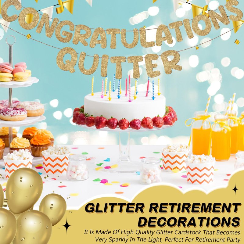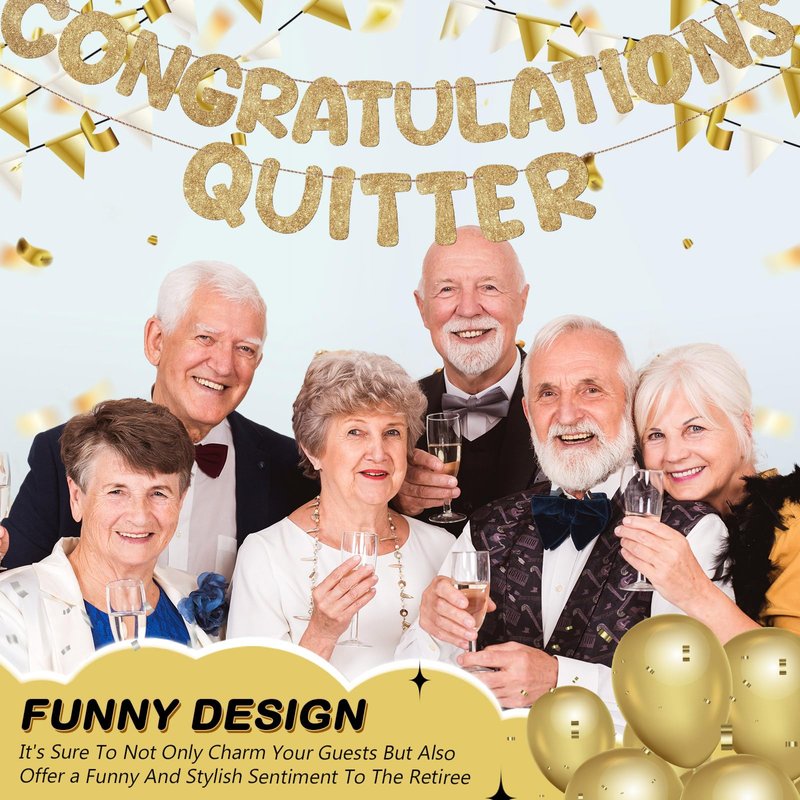 - Celebrating Retirement in Style: our quitter retirement gifts celebrate the tireless efforts of a person heading into retirement; They maintain the retirement atmosphere with a balance of sparkly, glittery elements and cheer; They will make your retirement party decorations shine and provide an unforgettable celebration for you and your loved ones