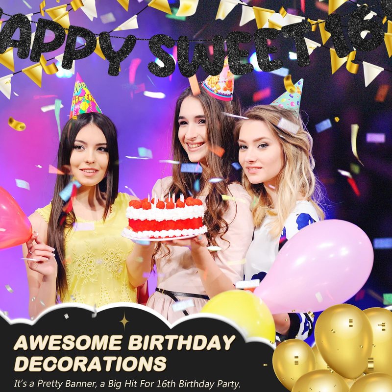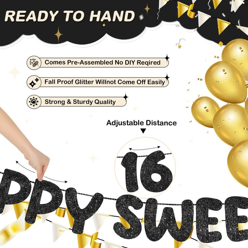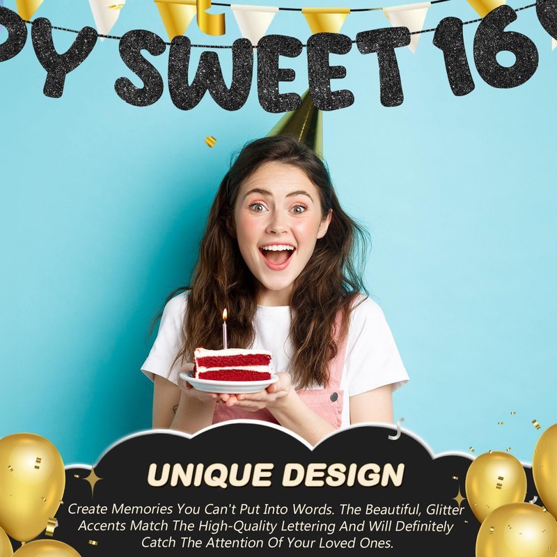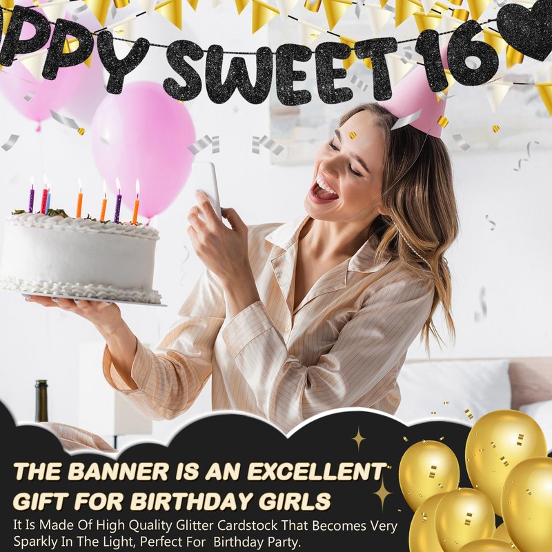 - Exquisite Black Color: the tastefully chosen black color adds a balance of elegance and glam to your party decorations; Happy sweet 16 birthday banner symbolizes celebration, lending a charm to the birthday event; Its sophisticated color matches well with various party themes, leaving the guests in awe and significantly enhancing the celebratory atmosphere