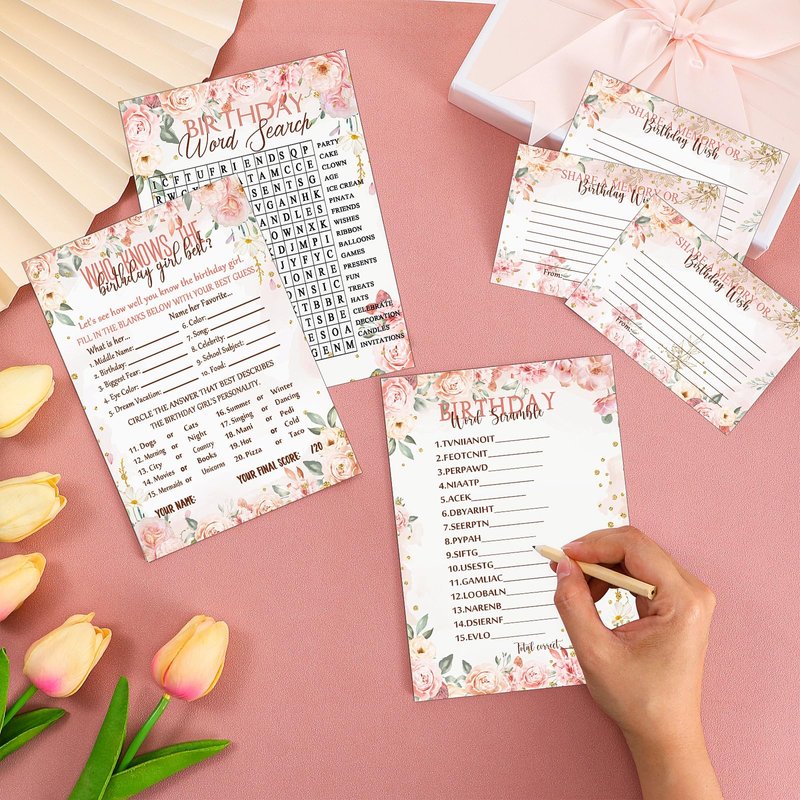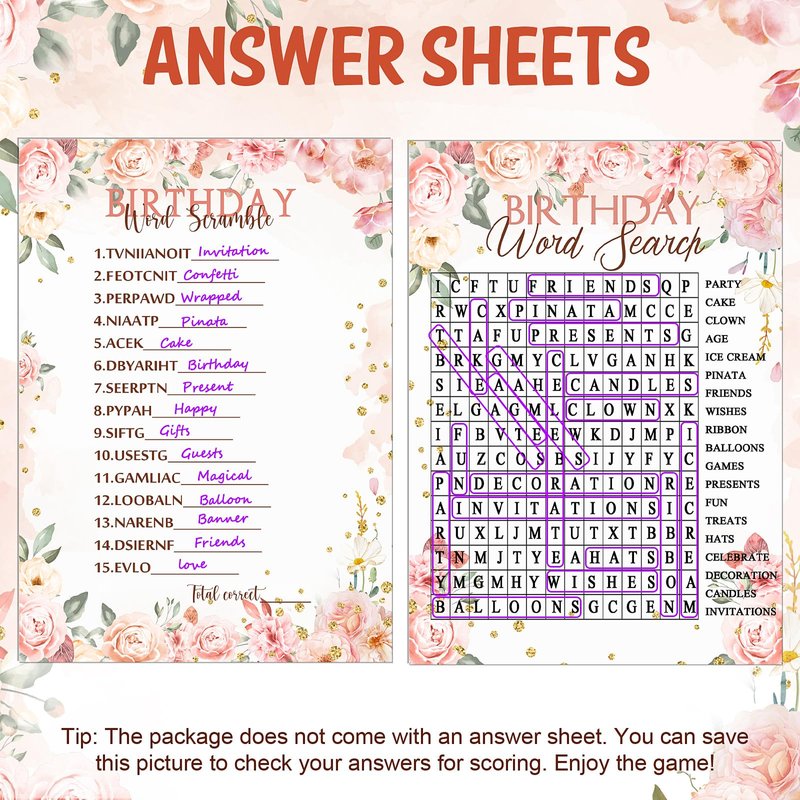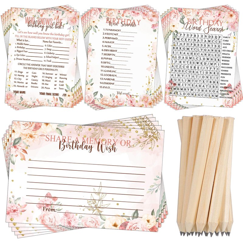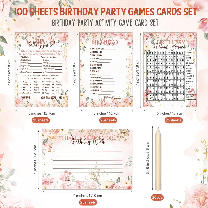 - Rich Combination of Game Cards: you will receive a total of 100 sheets of birthday cards in 4 different activities, respectively [Word Search], [Word Scramble], [Who knows the birthday girl best], and [Share your memories and wishes], 25 sheets for each activities, and 20 pieces pre pointed wood short pencils, which can cater for 25 guests playing games