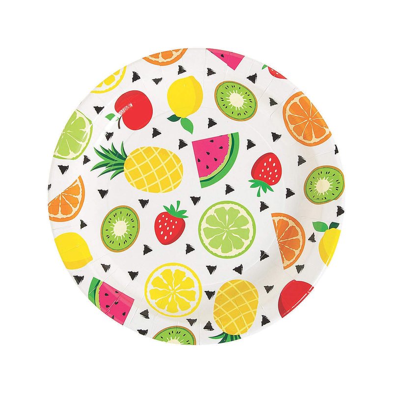 - Throw a fruit-tastic party with this Tutti Frutti theme! Printed with pineapples, citrus fruits and berries, these Tutti Frutti Paper Dinner Plates add fresh pops of color to your event. Create a fruit-themed tablescape by arranging these paper plates at each guest's place and colorful table decorations down the center of the table! Paper. (8 pcs. per unit) 9"