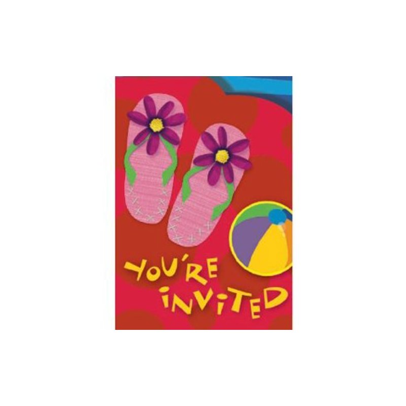 Fun in the Sun Invitations are die-cut and feature bright flip flops. 8 invitations and envelopes included. Reads "You're Invited" on the front and "For", "Date", "Time", "Place" and "RSVP" and the inside.